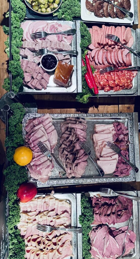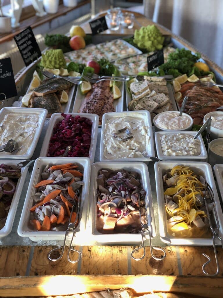 bl.a. egeninlagd sill, egengravad lax och köttråvaror från närområdet.